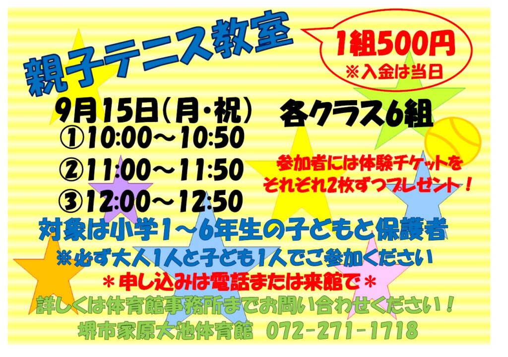 2025年08月29日 親子で一緒にテニスをやりませんか? 9月15日(月・祝)に親子テニスイベントを開催します! 室内で、親子のコミュニケーションをとりつつ、テニスで身体を動かしませんか? なんと、500円のワンコインで楽しめます! 初めてでも大丈夫!一度やってみましょう!!