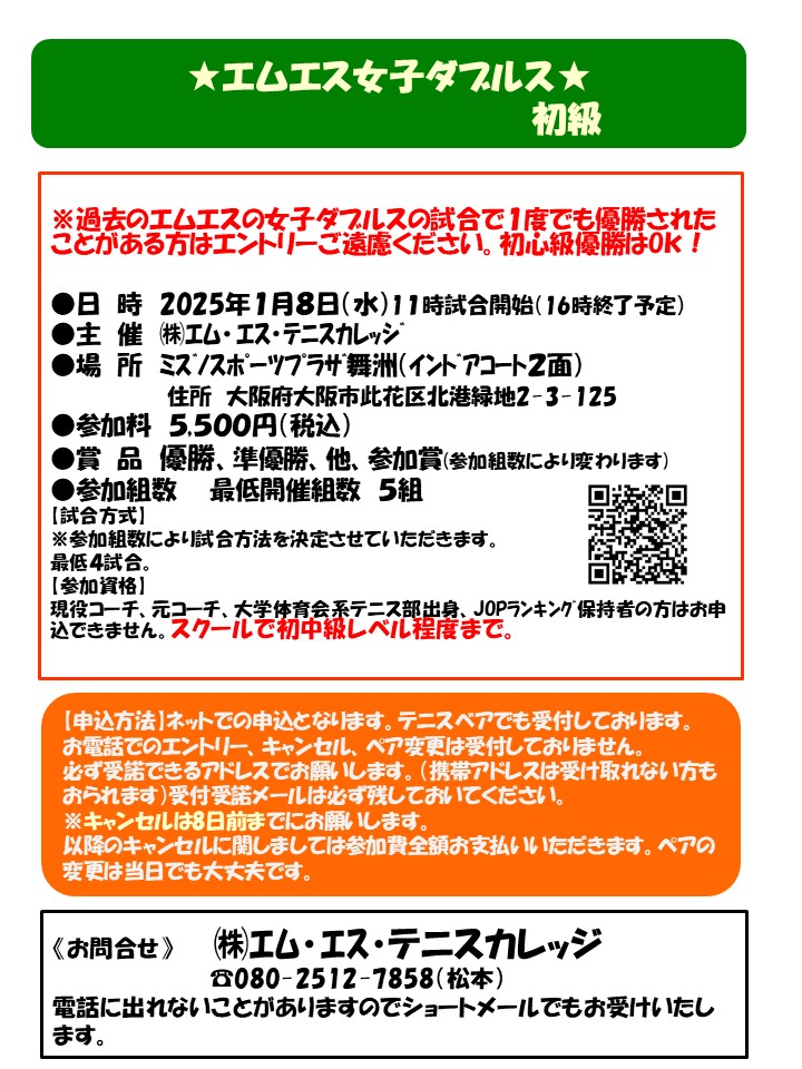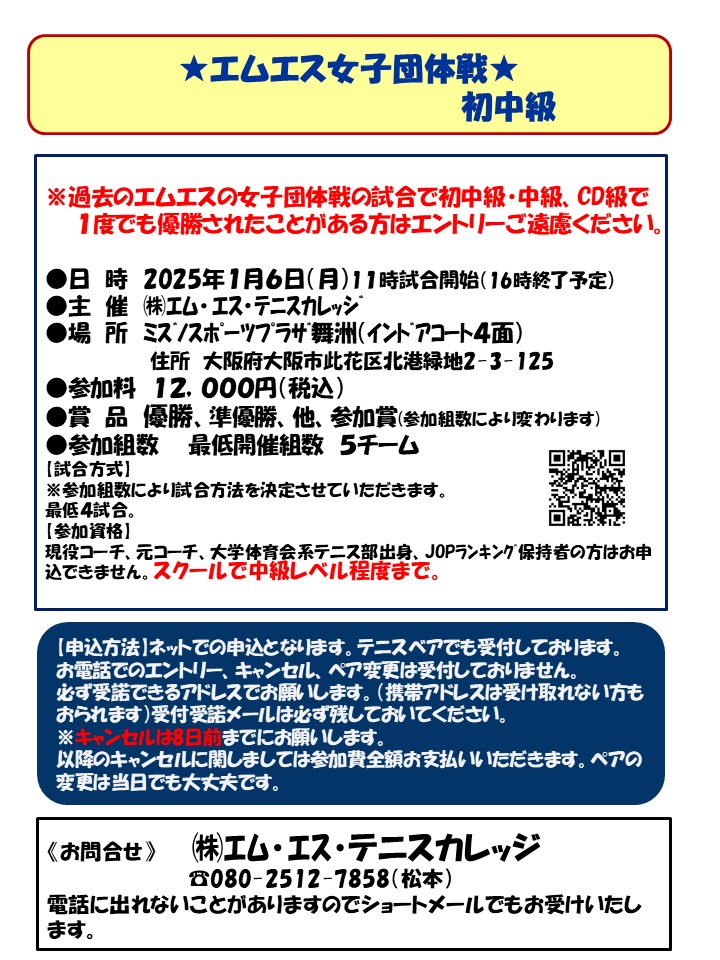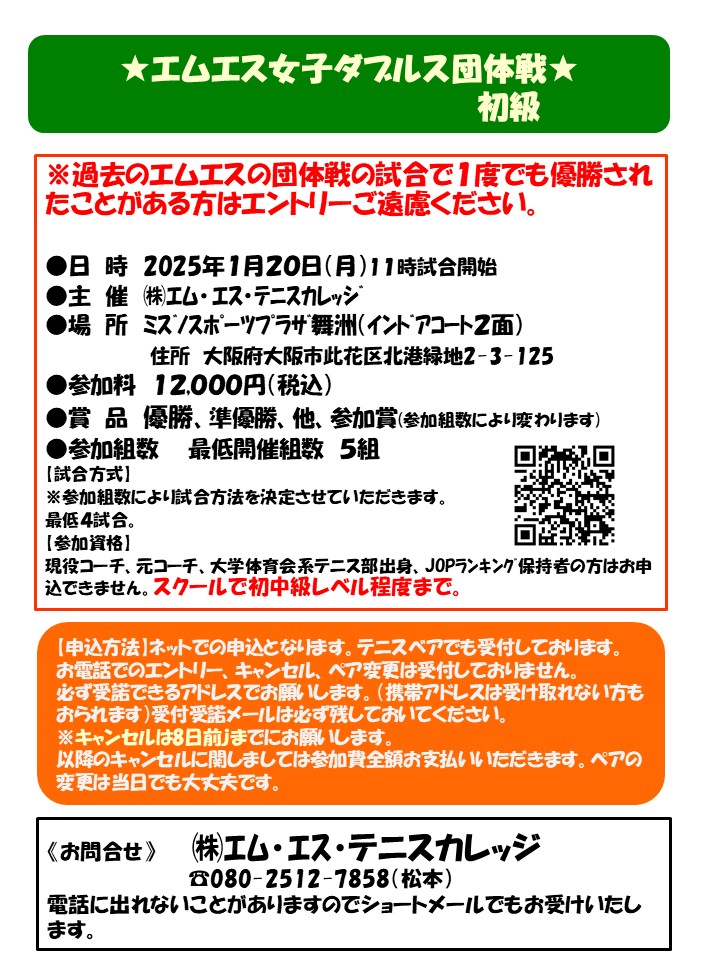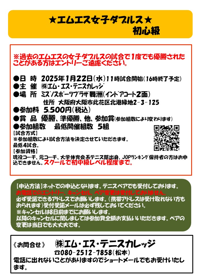 ★初級はスクールで初中級レベル程度。エムエスの試合(初心級は除く)で1回でも優勝されたことがある方はエントリーご遠慮