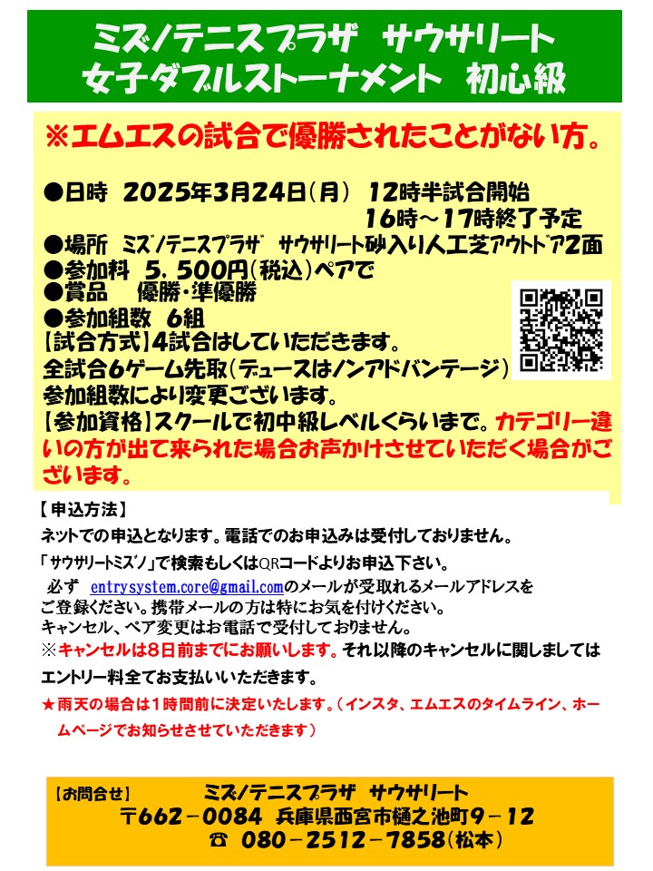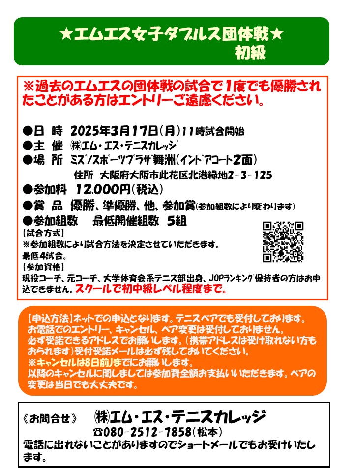 過去にエムエスの女子ダブルスの試合で優勝されたことがある方は初心級、初級(初心級優勝は大丈夫です)の試合のエントリーはご遠慮くださいますようよろしくお願いいたします。確認させていただくこともございますのでよろしくお願いいたします。
