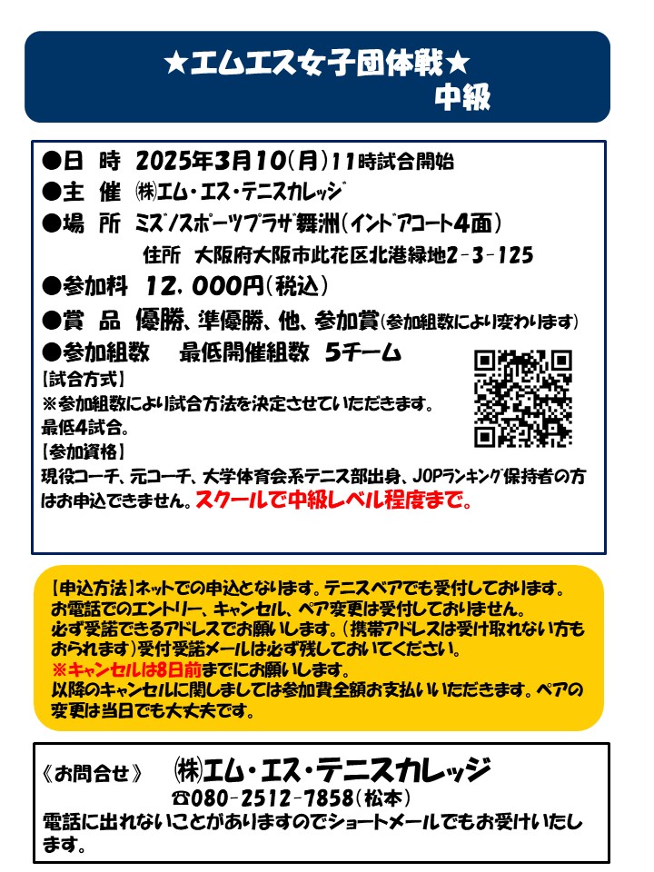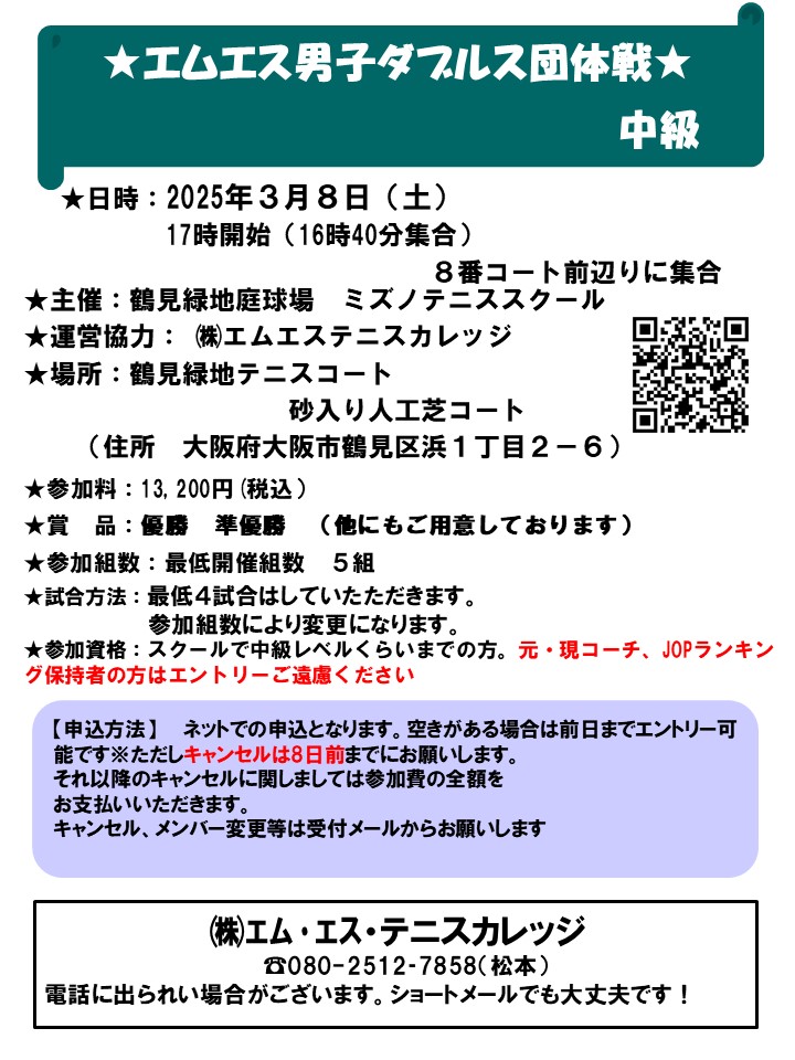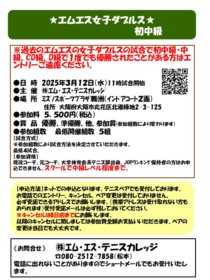 過去にエムエスの女子ダブルスの試合で初中級・中級、D級、DE級、CD級で優勝されたことがある方はエントリーご遠慮ください。
