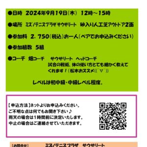 続きを読む9月19日 木曜日 女子ダブルス 練習会のお知らせです! 普段はジュニア、プライベートのお忙しいコーチなのでなかなか女子の練習会までやっていただけませんでしたが… ようやく開催です♪ 空きがあれば入りたいどこでしたが…す […]