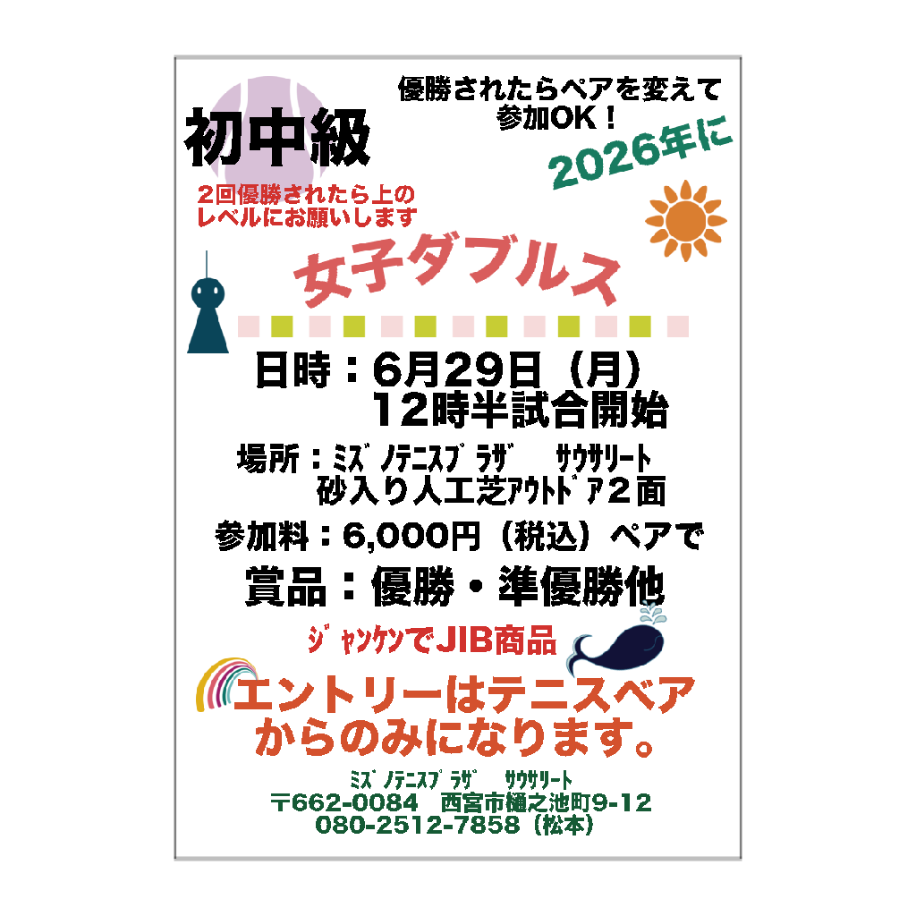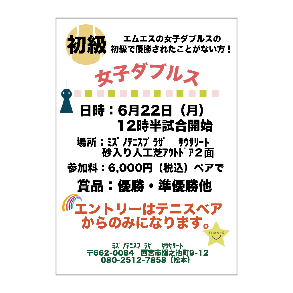 2026年6月22日(月)女子ダブルス初級の申込みはテニスベアからお願い致します