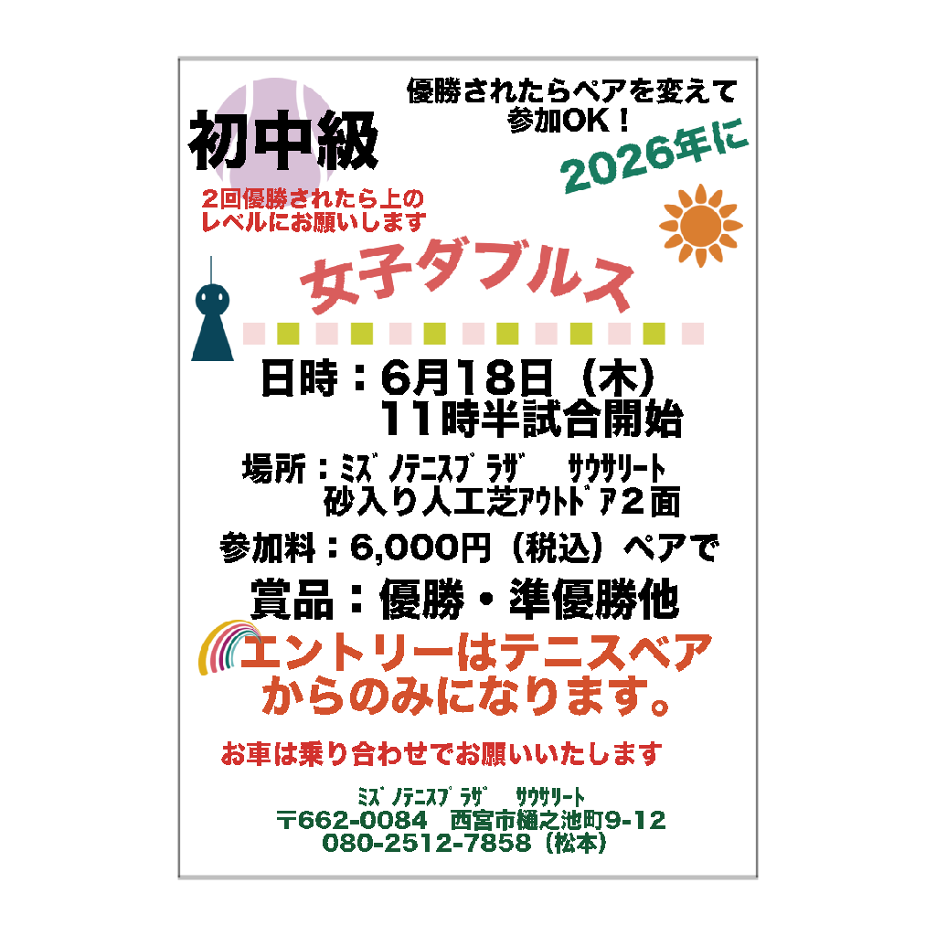 2026年6月18日(木)女子ダブルス初中級の申込みはテニスベアからお願い致します