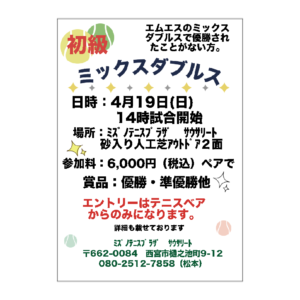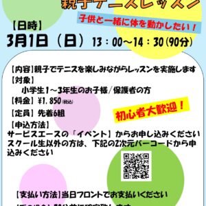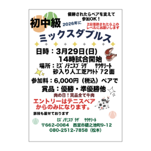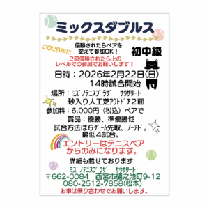 続きを読む2026年2月22日(日)ミックスダブルス初中級の申込みはテニスベアからお願い致します