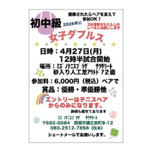 続きを読む2月よりエントリー方法がテニスベアのみになります 2026年4月27日(月)女子ダブルス初中級の申込みはテニスベアからお願い致します 2026年4月20日(月)女子ダブルス初級の申込みはテニスベアからお願い […]