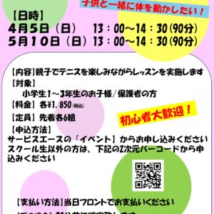 続きを読むスクール生の方はサービスエースからお申込みください スクール生以外の方は下記の2次元バーコードから申込みください 4月5日(日)13:00~14:30親子テニスレッスン https://mizuno.lan.jp/sau […]