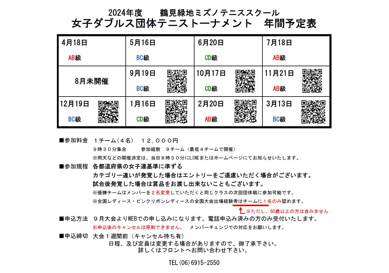 2024年08月21日 2024年度レディース団体戦 年間スケジュール 2024年度のレディース団体戦の年間スケジュールです。 9月度から申込み方法がWEB申込みに変更になりました。 QRコードを読み取り申込みフォームからエントリーをお願いいたします。 1月~3月大会のQRコードを修正しております。