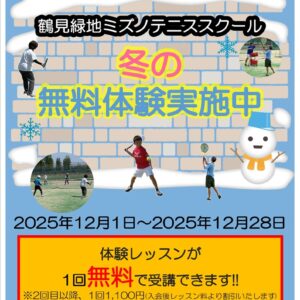鶴見緑地ミズノテニススクーでは 「無料体験レッスン」を行っております はじめてテニスを始める方からテニス経験者まで 1回無料で受講いただけます (2回目以降は受講料税込み1,100円 入会頂ければレッスン料から相殺いたし […]